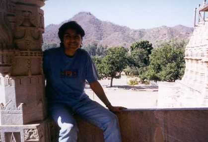 Relaxing on the ledge of the Jain temple. Trees and hills in background are within view from the Jain sanctuary.